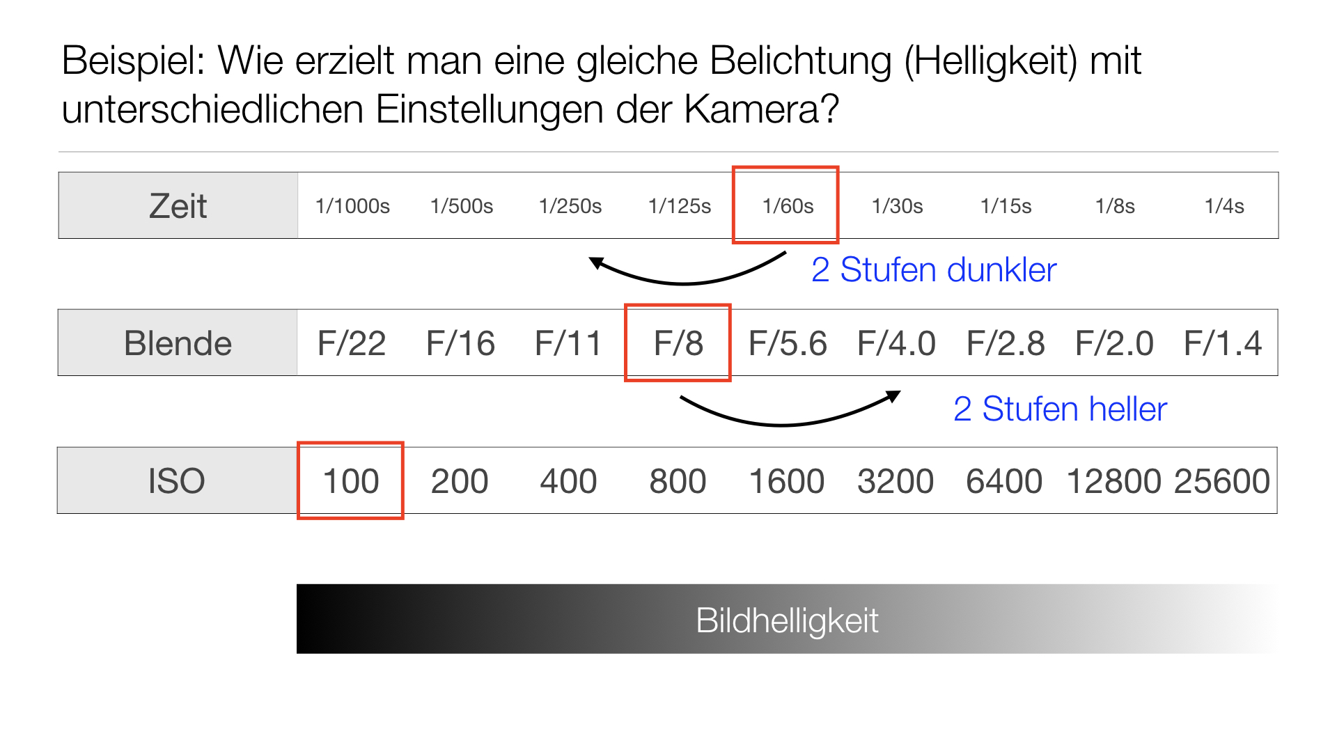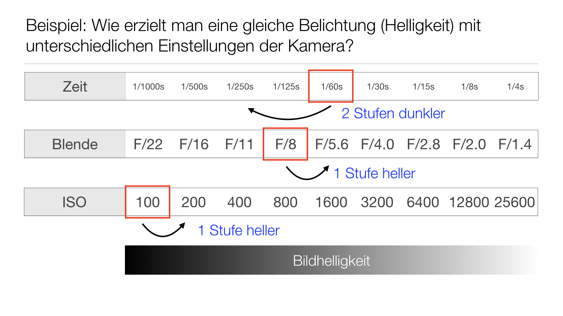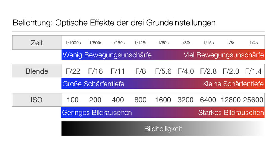2. Optische/visuelle Funktion von Zeit, Blende und ISO: